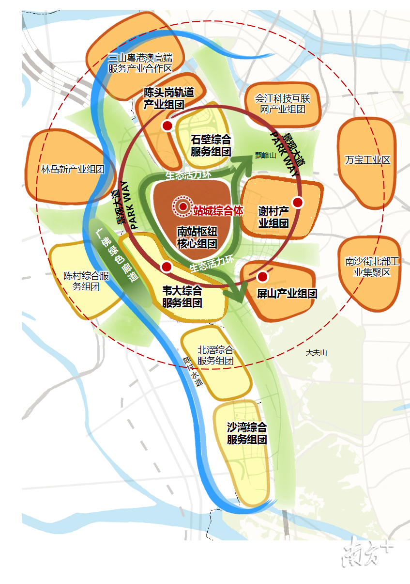 南站地區(qū)為“1+4”廣佛高質(zhì)量發(fā)展融合試驗區(qū)先導區(qū)的重要組成部分,周邊有佛山三龍灣片區(qū)、漢溪長隆商務旅游區(qū)、荔灣海龍科創(chuàng)區(qū)等產(chǎn)業(yè)發(fā)展區(qū)。同時番禺鐘村片區(qū)、順德陳村片區(qū)等已集聚了一定規(guī)模的人口。具備輻射周邊、形成產(chǎn)業(yè)協(xié)調(diào)發(fā)展的基礎條件。